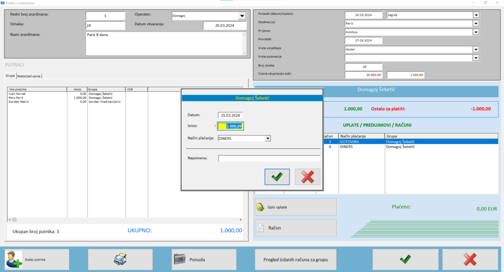 Aplikacija za turističke agencije je napravljena da bi se lakše vodile sve evidencije koje su potrebne za izračun troškova putovanja kao i za kompletna evidencija putnika i naručitelja aranžmana. Fakturiranje se AUTOMATSKI vrši za narućitelja  ili za sudionike putovanja. Program sadrži Salda Konti svakog putnika ili grupe putnika.
